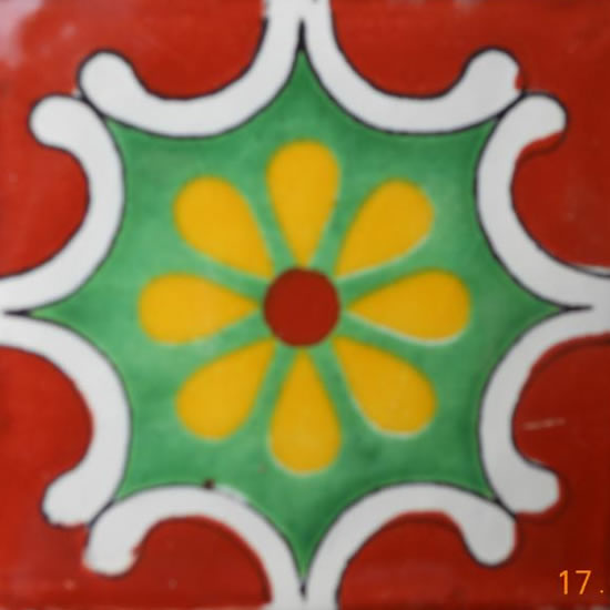 Azulejo de talavera 10×10 con flor al centro color amarillo colores: blanco, amarillo, terracota y verde.
