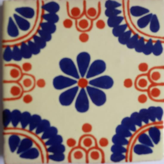 Azulejo de talavera 10×10 con flor color azul al centro, con colores también, azul,rosa,blanco, verde,rojo.Ideal para decoración de baños,albercas,cocinas y fuentes.
