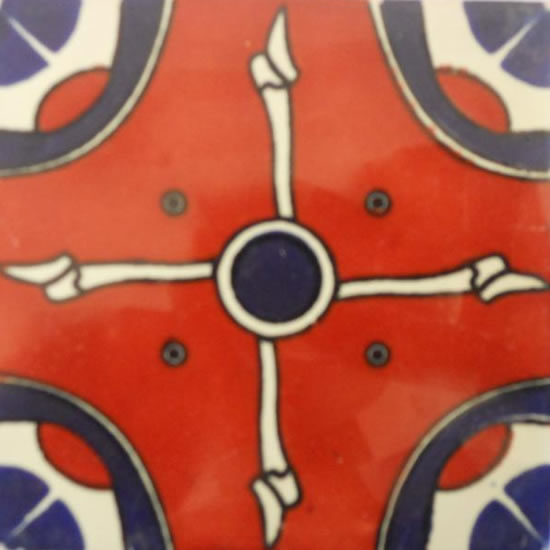 Azulejo de Talavera 10×10 formajo d una cruz al centro, colores azul con terracota.